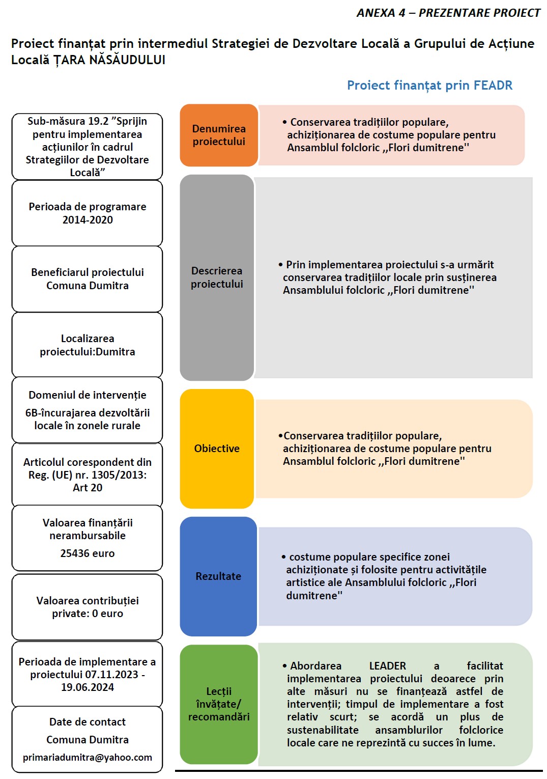 Conservarea tradițiilor populare, achiziționarea de costume populare pentru Ansamblul folcloric "Flori dumitrene"