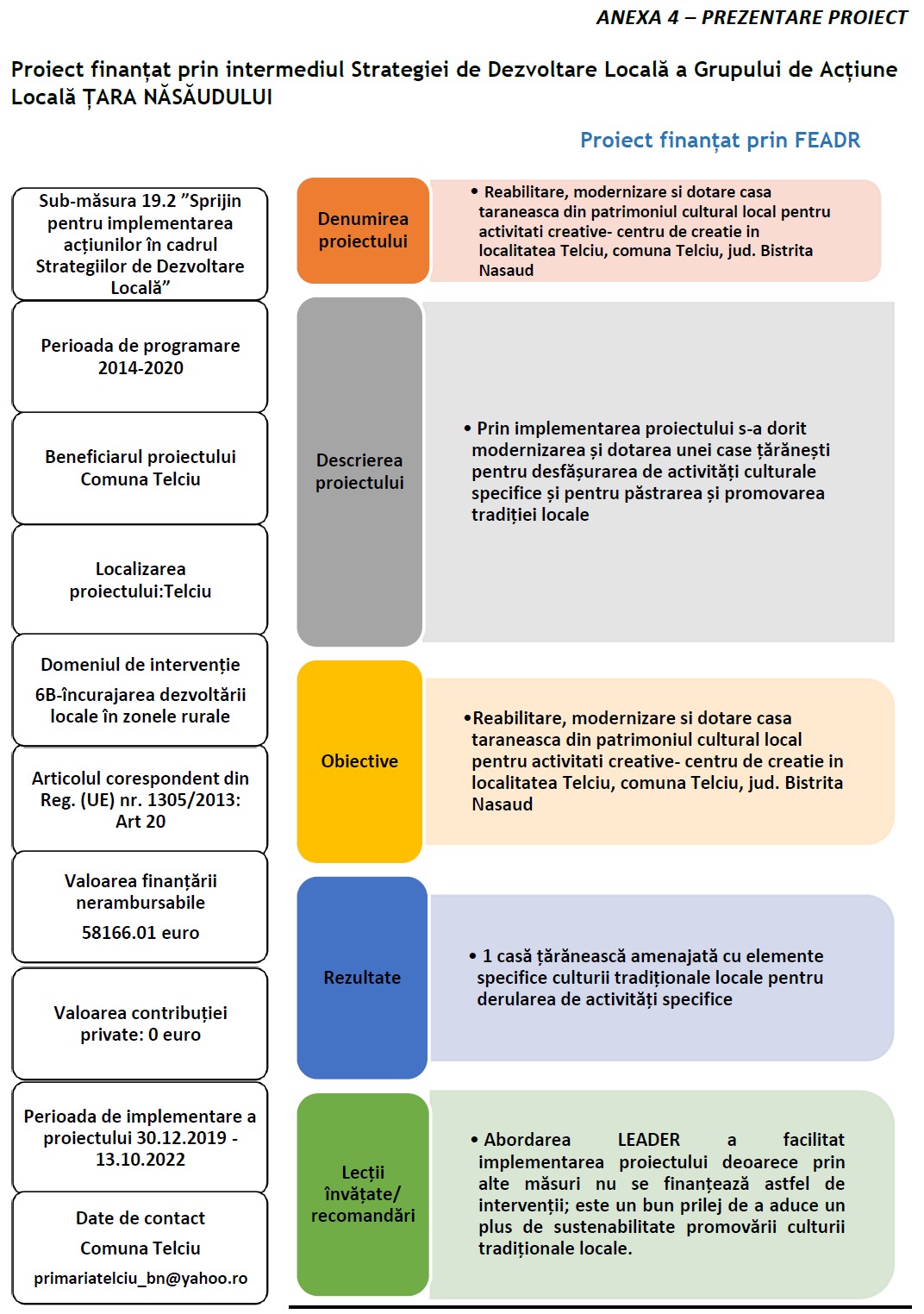 Reabilitare, modernizare si dotare casă țărănească din patrimoniul cultural local pentru activități creative - centru de creație în localitatea Telciu, comuna Telciu